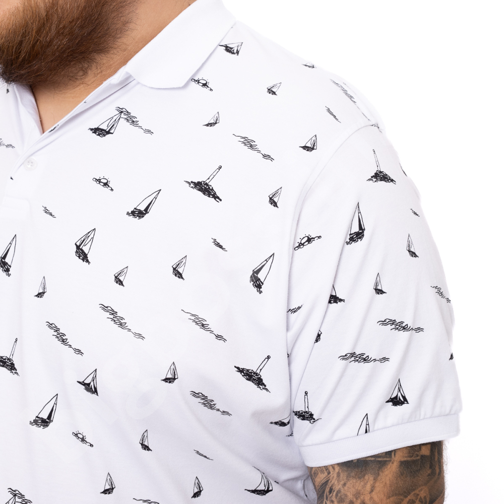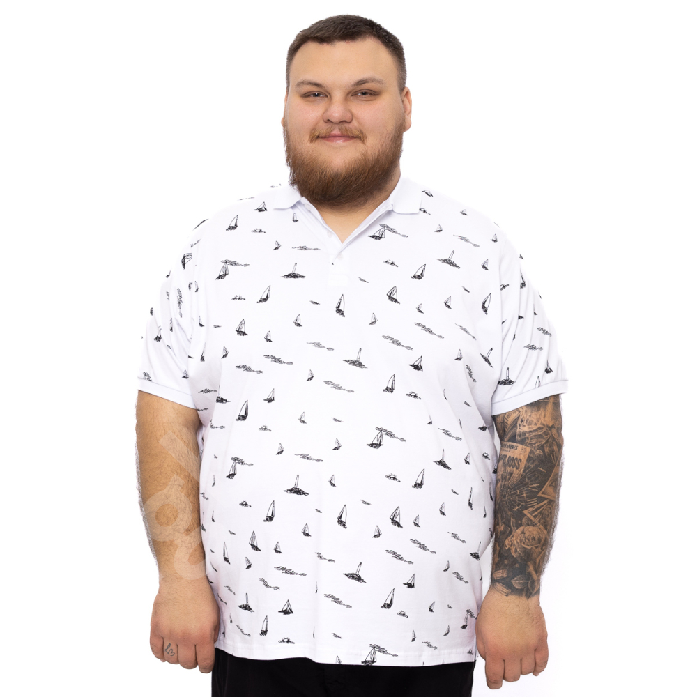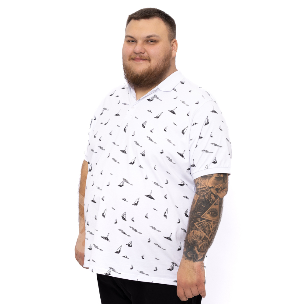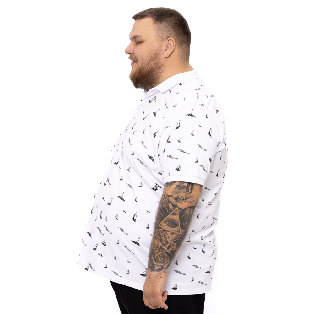 Поло большого размера Annex. Выполнено из 95% хлопка и 5%эластана (ткань лакоста), цвет белый в принт. Низ прямого кроя, рукава на манжете.