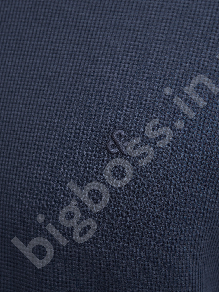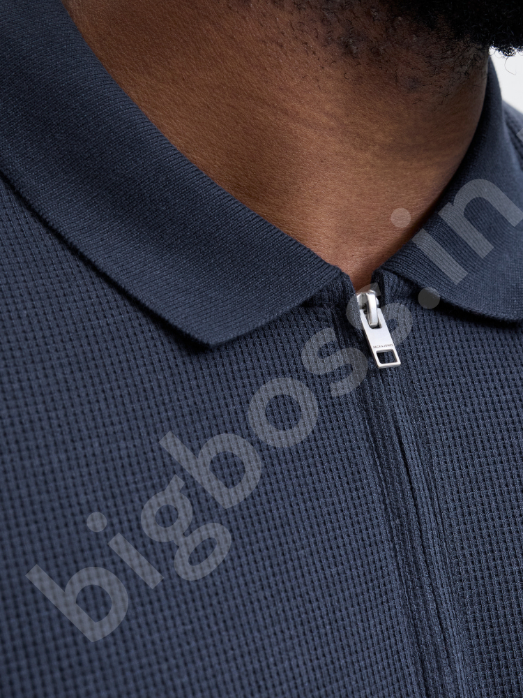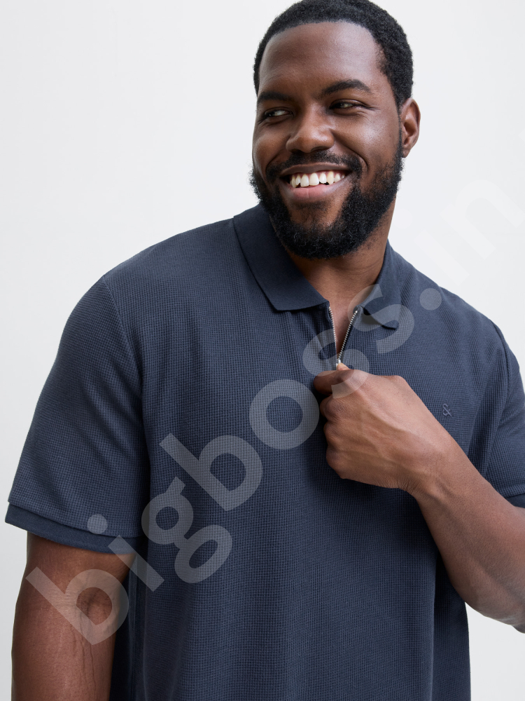 Футболка поло большого размера Jack & Jones. Ткань структурная, в мелкую клетку. Цвет тёмно синий. Застёжка на молнии.