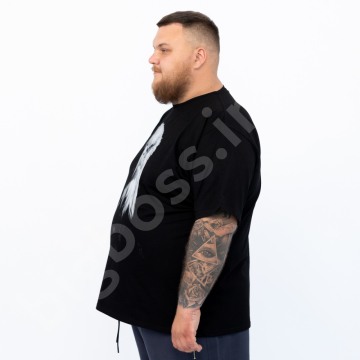 Описание Мужская футболка большого размера Big Team. Выполнена из 95% хлопка и 5% эластана, чёрного цвета. Футболка хорошо тянется. Спереди нанесён принт.