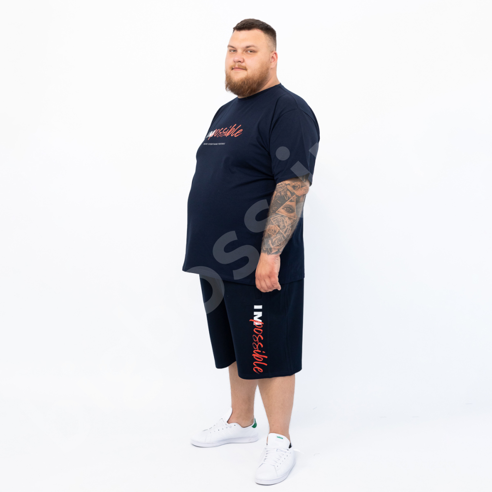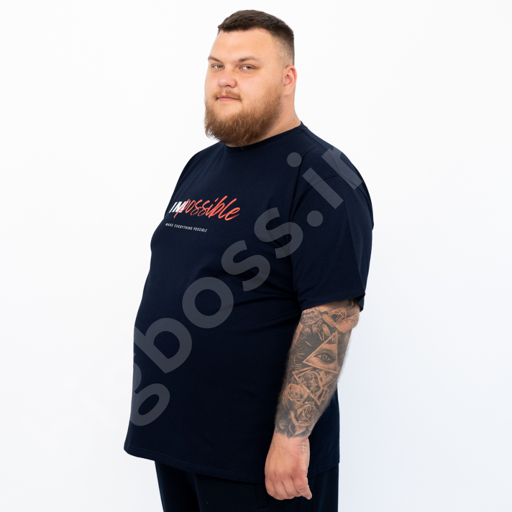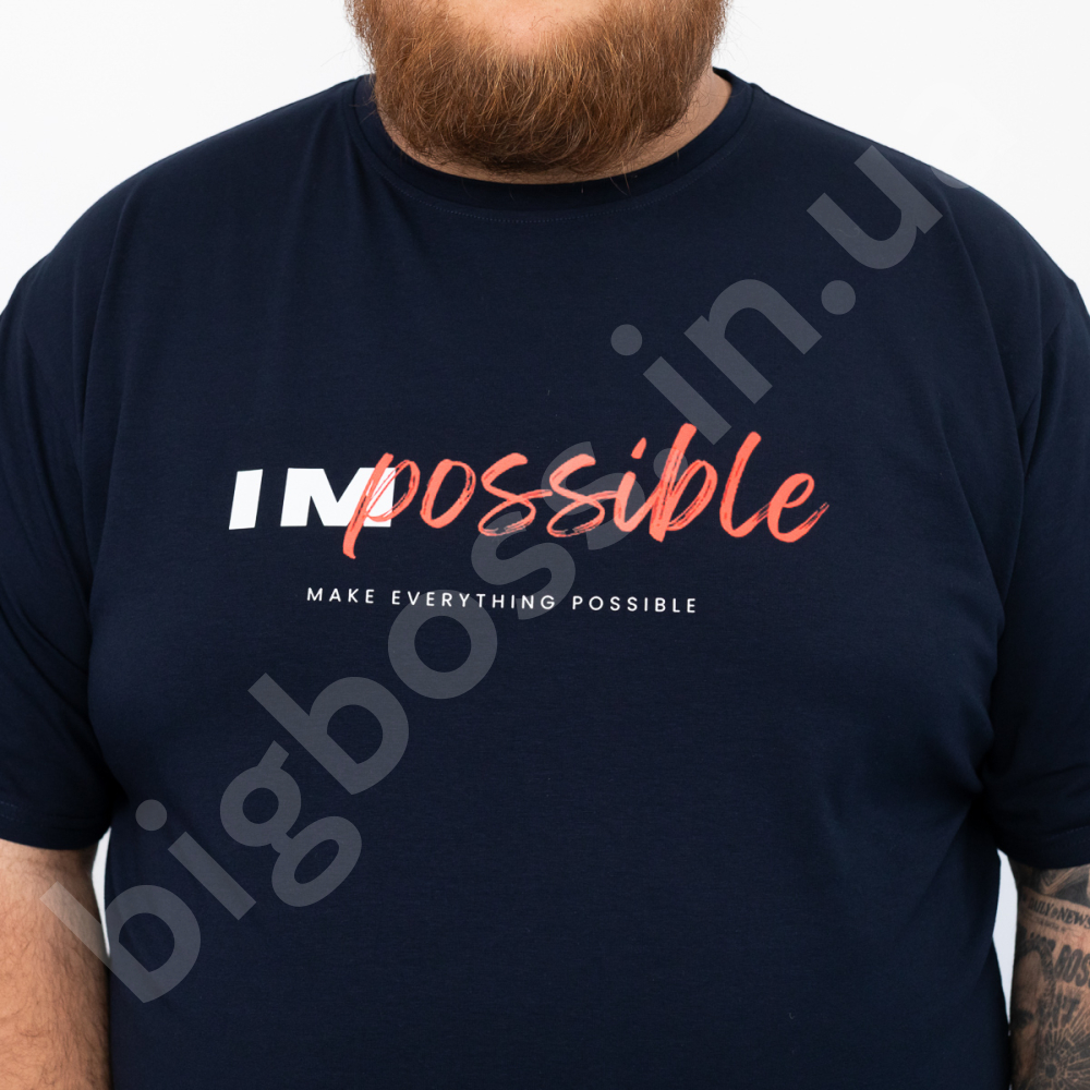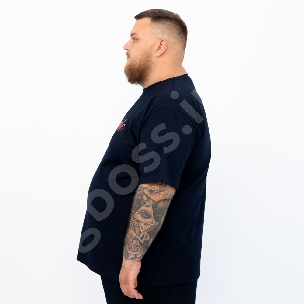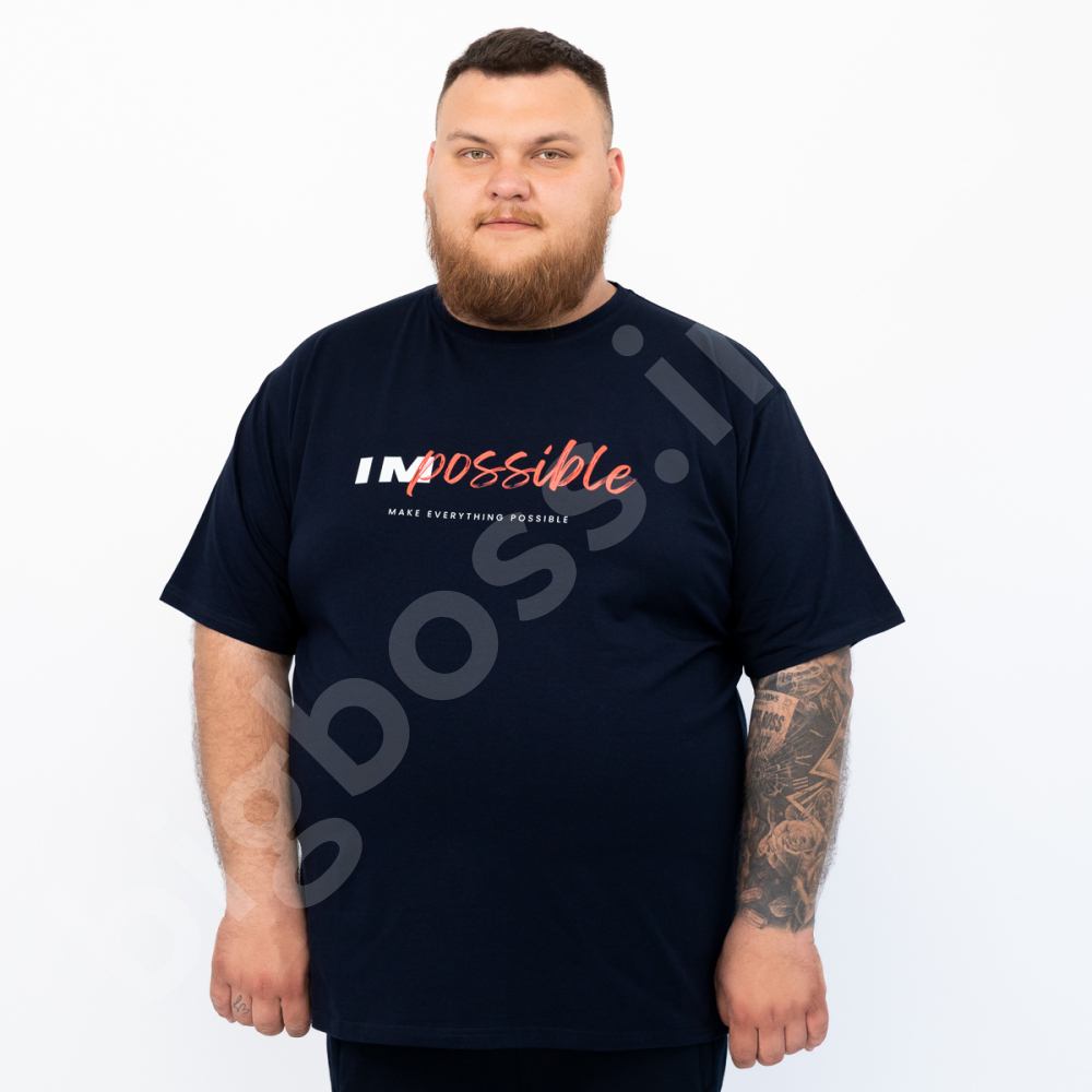 Описание Мужская футболка большого размера Big Team. Выполнена из 95% хлопка и 5% эластана, тёмно синего цвета. Футболка хорошо тянется. Спереди нанесён принт.