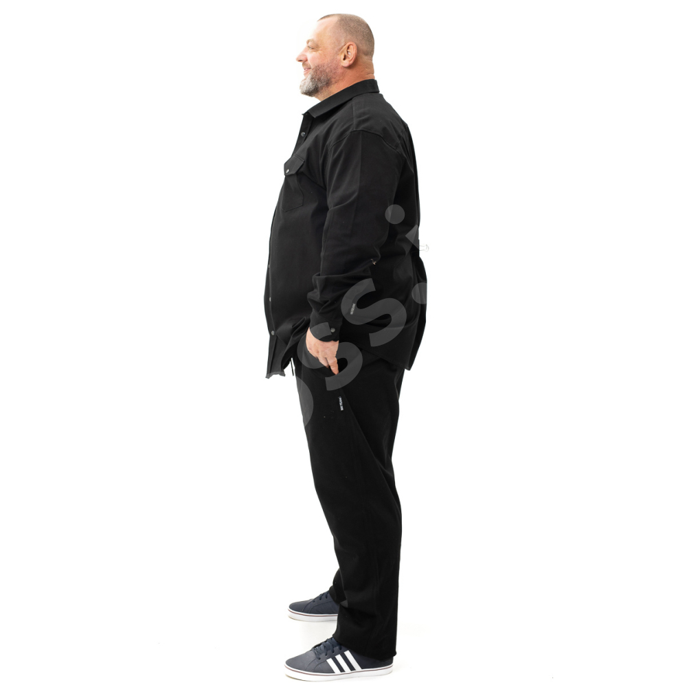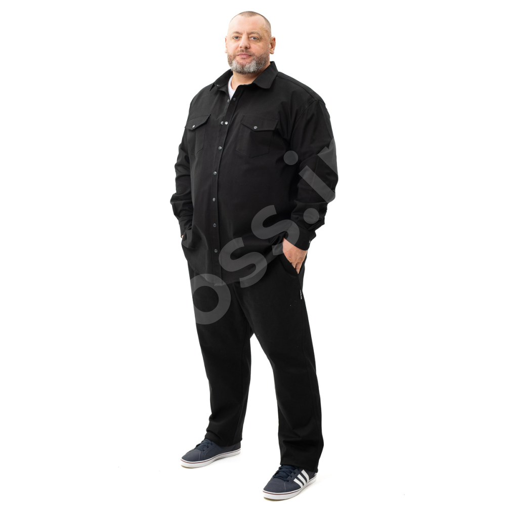 Описание Мужской костюм большого размера Big Team. Рубашка и штаны чёрного цвета , выполнены из 97% хлопка и 3% эластана, ткань тянется. Рубашка на кнопках, спереди 2 кармана с клапанами. Штаны в поясе на резинке и шнуровке. Спереди 2 кармана кармана, также есть 2 кармана сзади.Ткань прочная, тянется, не совсем тонкая, но очень приятная на ощупь.РАЗМЕРЫ МОЖНО РАСПАРОВЫВАТЬ!!!