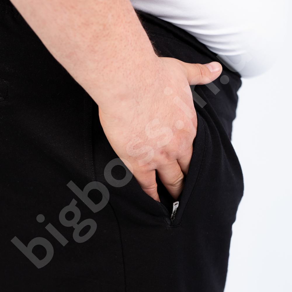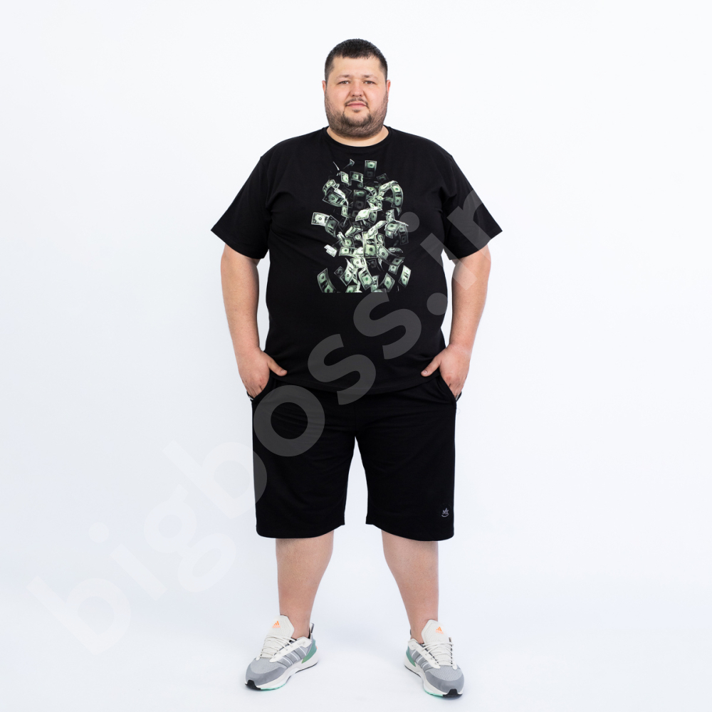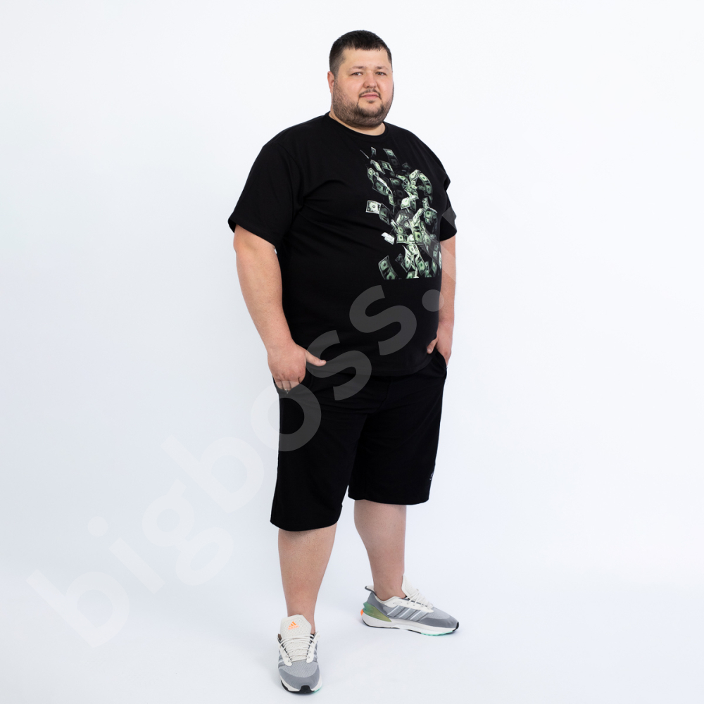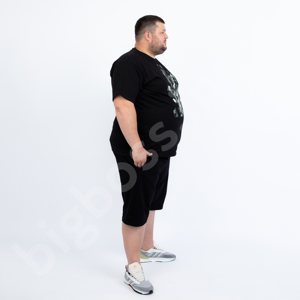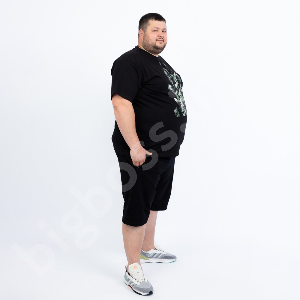 Описание Мужская футболка большого размера Big Team. Выполнена из 95% хлопка и 5% эластана, чёрного цвета. Футболка хорошо тянется. На груди принт.Мужские шорты большого размера Annex. Выполнены из мягкого трикотажа в чёрном цвете. Ткань тонкая, приятная к телу, тянется.Пояс на резинке со шнурком, спереди 2 кармана и один сзади назамке. Состав ткани: 75% хлопок, 17% полиестер и 8% эластан.