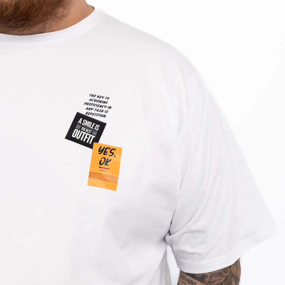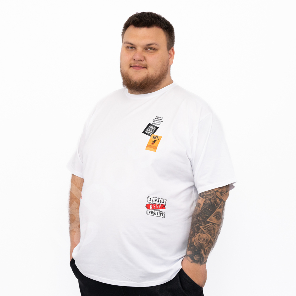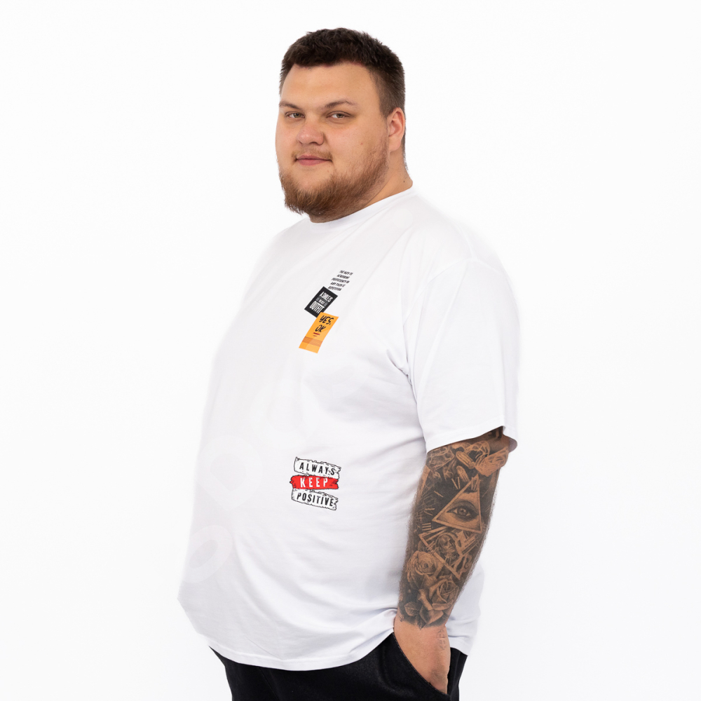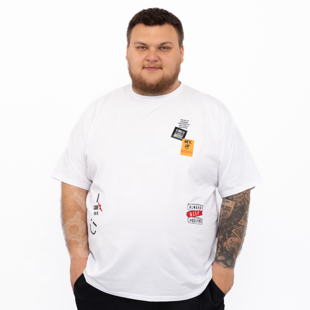 Опис Чоловіча футболка великого розміру Big Team. Виконана з 95% бавовни та 5% еластану, білого кольору. Футболка добре тягнеться. Спереду нанесено принт.