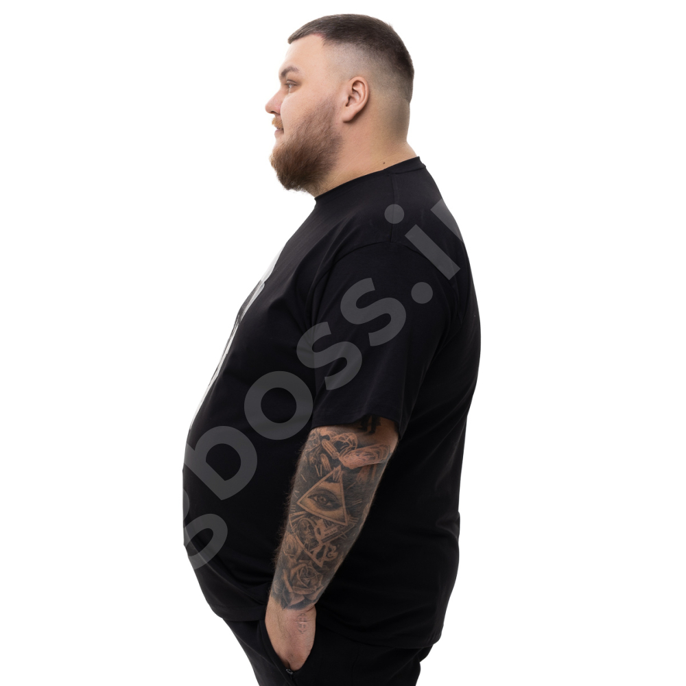 Чоловіча футболка великого розміру Big Team. Виконана з 95% бавовни та 5% еластану, колір чорний. Футболка добре тягнеться. Спереду нанесено принт.